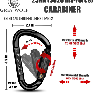 This heavy-duty locking carabiner clip is crafted for strength, reliability, and performance. Made from aircraft-grade aluminum, it supports up to 25kN (5,620 lbs) and features a secure twist-lock mechanism for quick, one-hand operation. Ideal for climbing, rappelling, rescue work, and outdoor adventures, this CE-certified carabiner ensures maximum safety during high-load activities. Its sleek black finish offers durability and corrosion resistance for long-term use in any environment.
